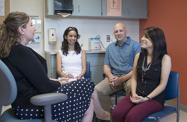 From left, Dr. Elizabeth Wallis meets with parents Jessica and Darren Mills and daughter Abigail at the Foster Care Support Clinic in MUSC Children's Hospital.