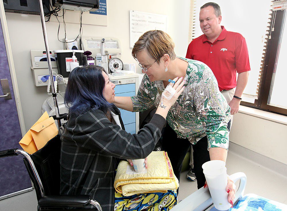 In Sarah’s hospital room, tears flow as Cox rises from her wheelchair with assistance. “I want to hug peanut,” she says, referring to Sarah.