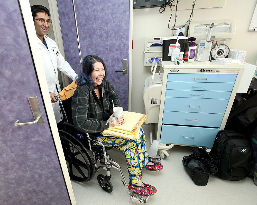 Sarah Larimore, a 12-year-old girl with pink streaks in her blonde hair, smiles as a young woman is rolled into her hospital room at MUSC Children’s Health in a wheelchair.