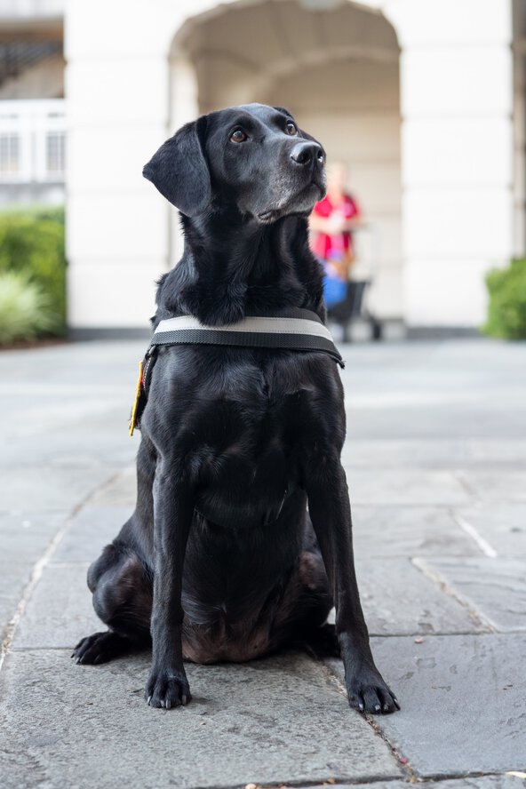 Zelda is the newest member of the Hospital Dog Team. She joined MUSC in June 2023. She is a young black golden retriever/lab mix named after the iconic Legend of Zelda game. She works in the MUSC Foster Care Clinic during medical visits and therapy sessions. Despite her laid-back personality, she is always hard at work sharing her love with the kids, foster parents and medical team.