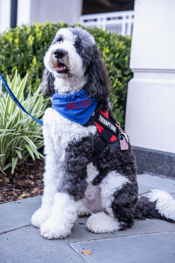 Cher joined MUSC in November 2022. She is a young golden doodle who was born to a small litter of two puppies, Sonny and Cher. She works alongside a dietician with our Cancer and Blood Disorders team to help children face food-related challenges.